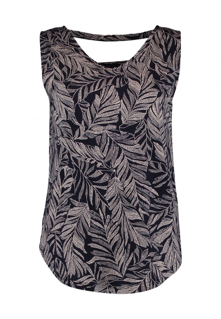 Canotta basica in tessuto leggero viscosa elasticizzata. Bretelle larghe, scollo a punta, doppia fascia sulla schiena. Fantasia foglie stilizzate. Vestibilità regolare. Composizione tessuto 95% viscosa 5% elastan.