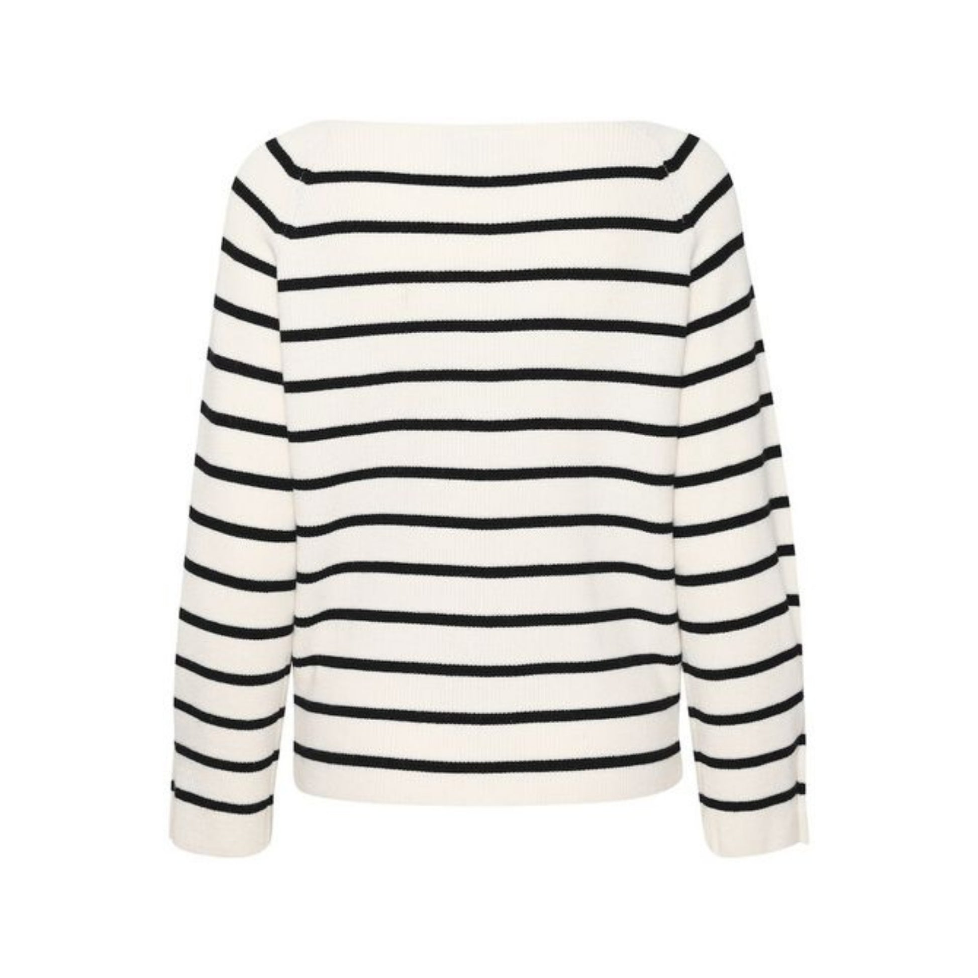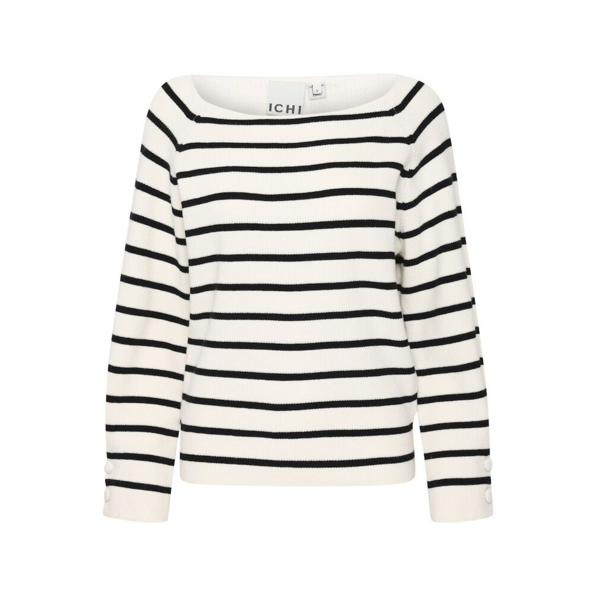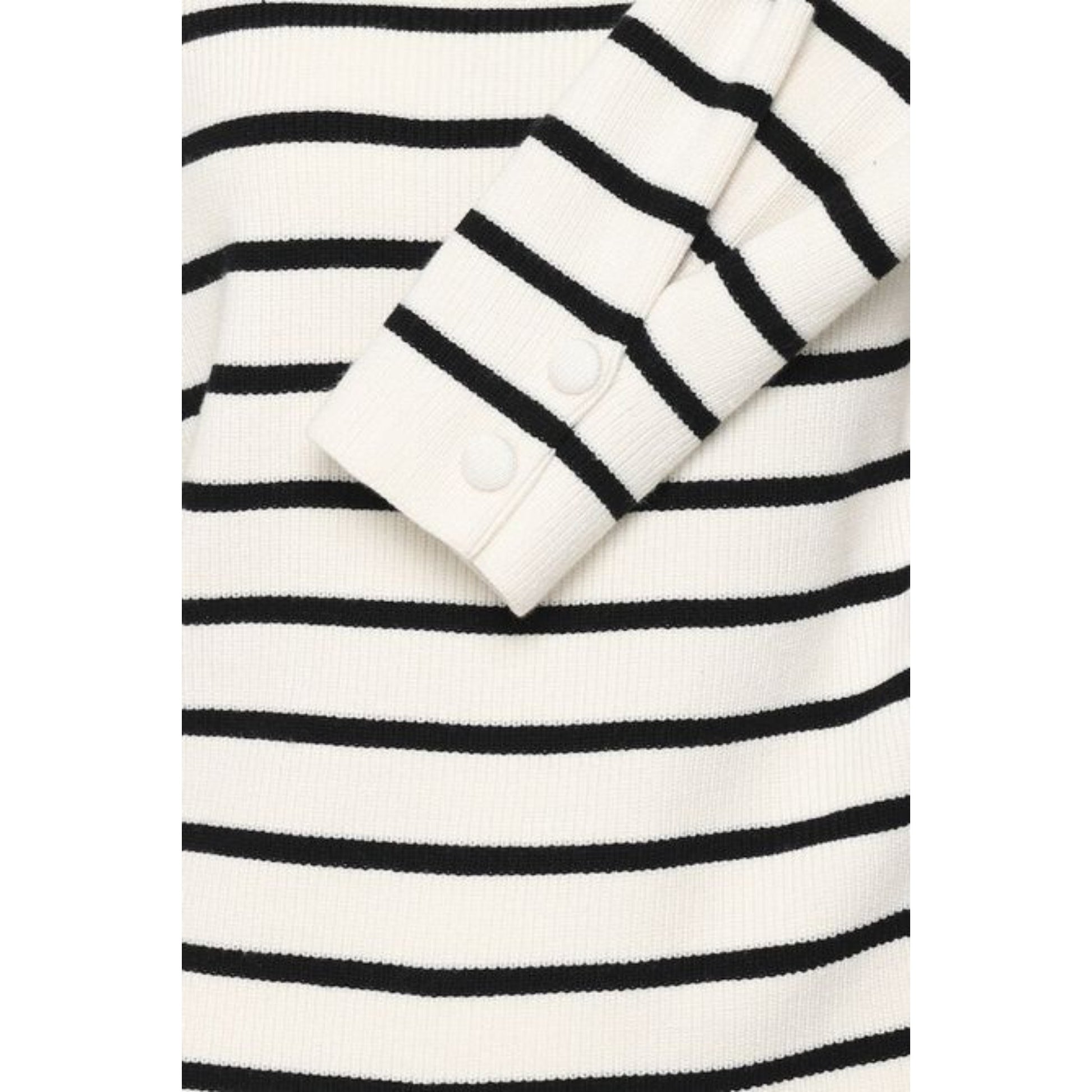 Maglia donna in tessuto misto viscosa lavorato a canaletti. Scollo ampio stondato. Maniche lunghe con polsini pinzati e bottoni rivestiti in tessuto. Motivo a righe doppio colore. Vestibilità dritta. Composizione tessuto 50% viscosa, 28% poliestere, 22% nylon.