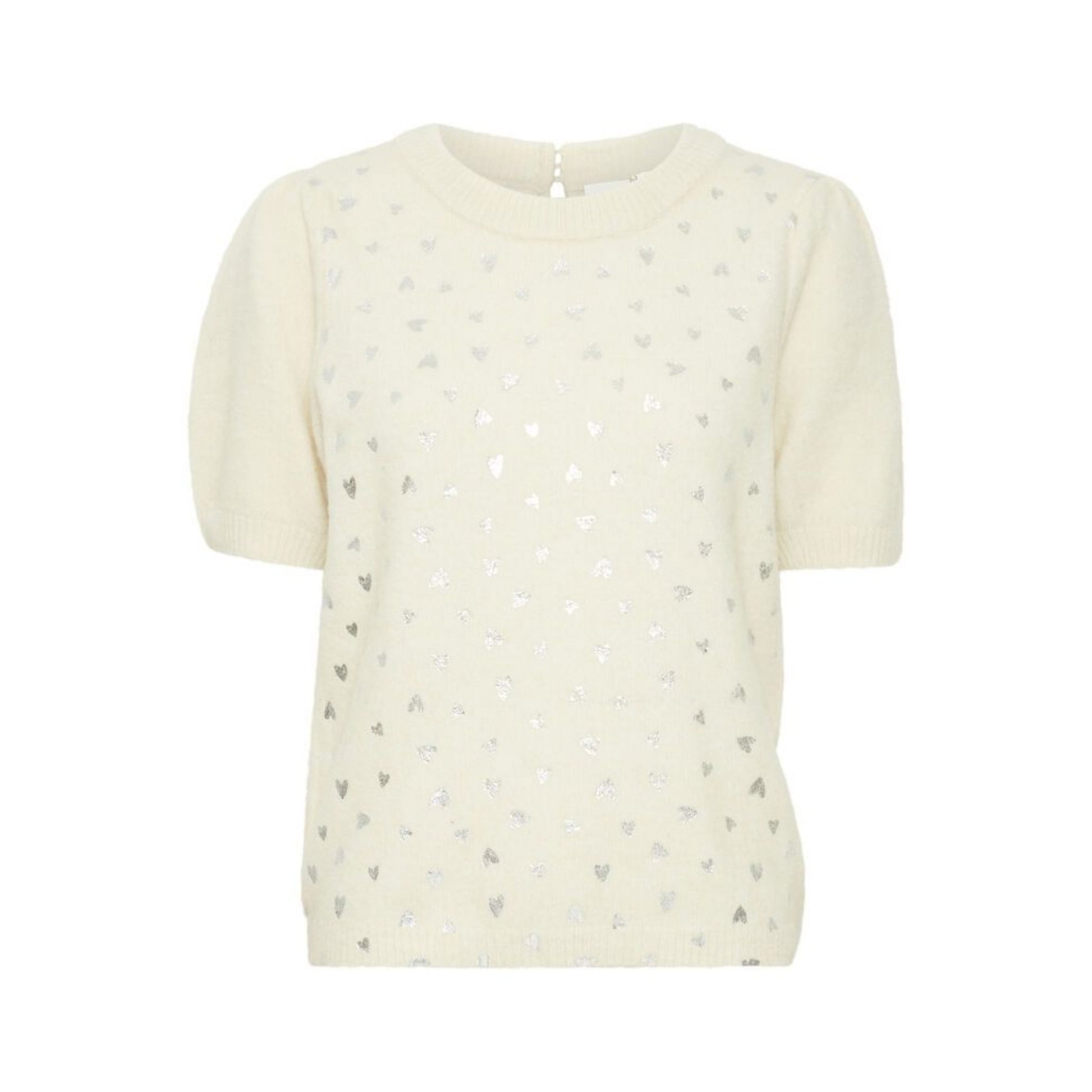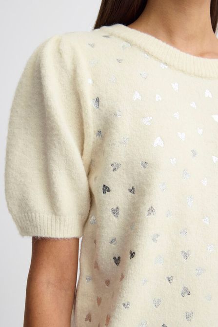 Maglia donna in tessuto mano lana realizzato con materiali riciclati. Girocollo con bordo largo, goccia sulla schiena e doppio bottone al collo. Maniche corte a palloncino. Stampa cuori argento sul davanti. Vestibilità comoda. Composizione tessuto