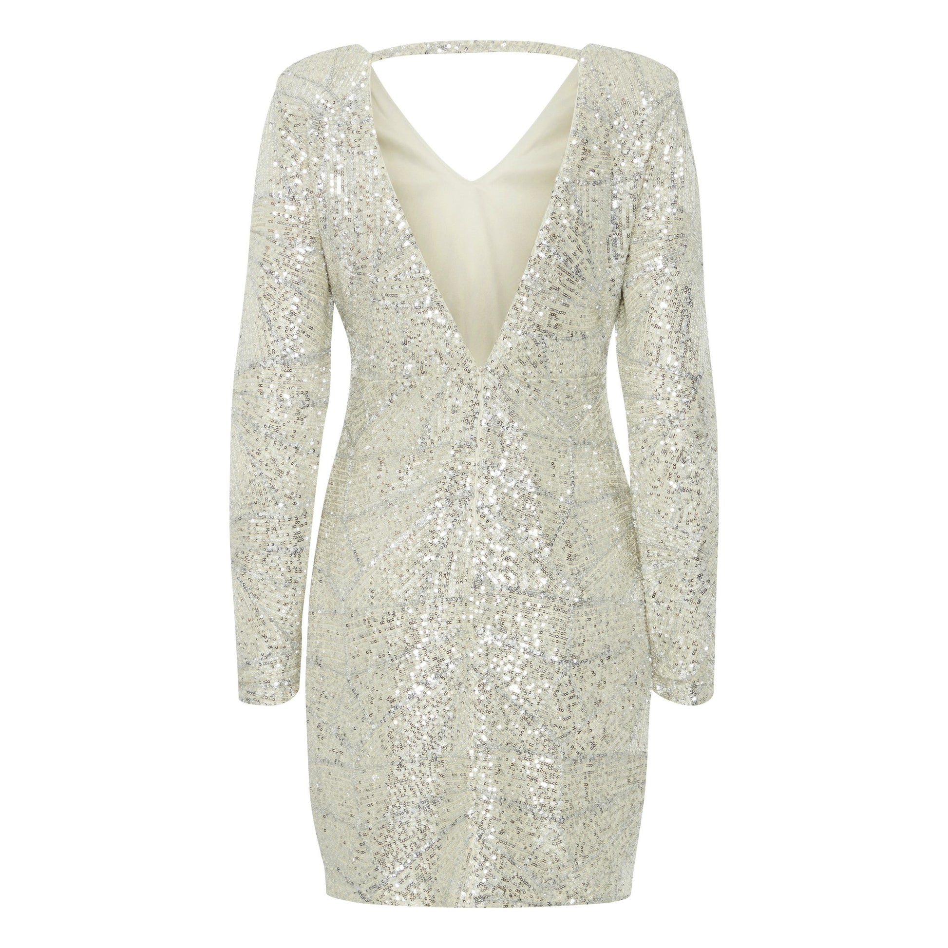 Vestito corto interamente decorato con paillettes. Scollo a punta regolare sul davanti e profondo sulla schiena, laccio sulle spalle. Maniche lunghe. Lunghezza sopra il ginocchio, vestibilità slim. Fodera in tessuto elasticizzato. Composizione tessuto 95% poliestere 5% elastan, fodera 100% poliestere.