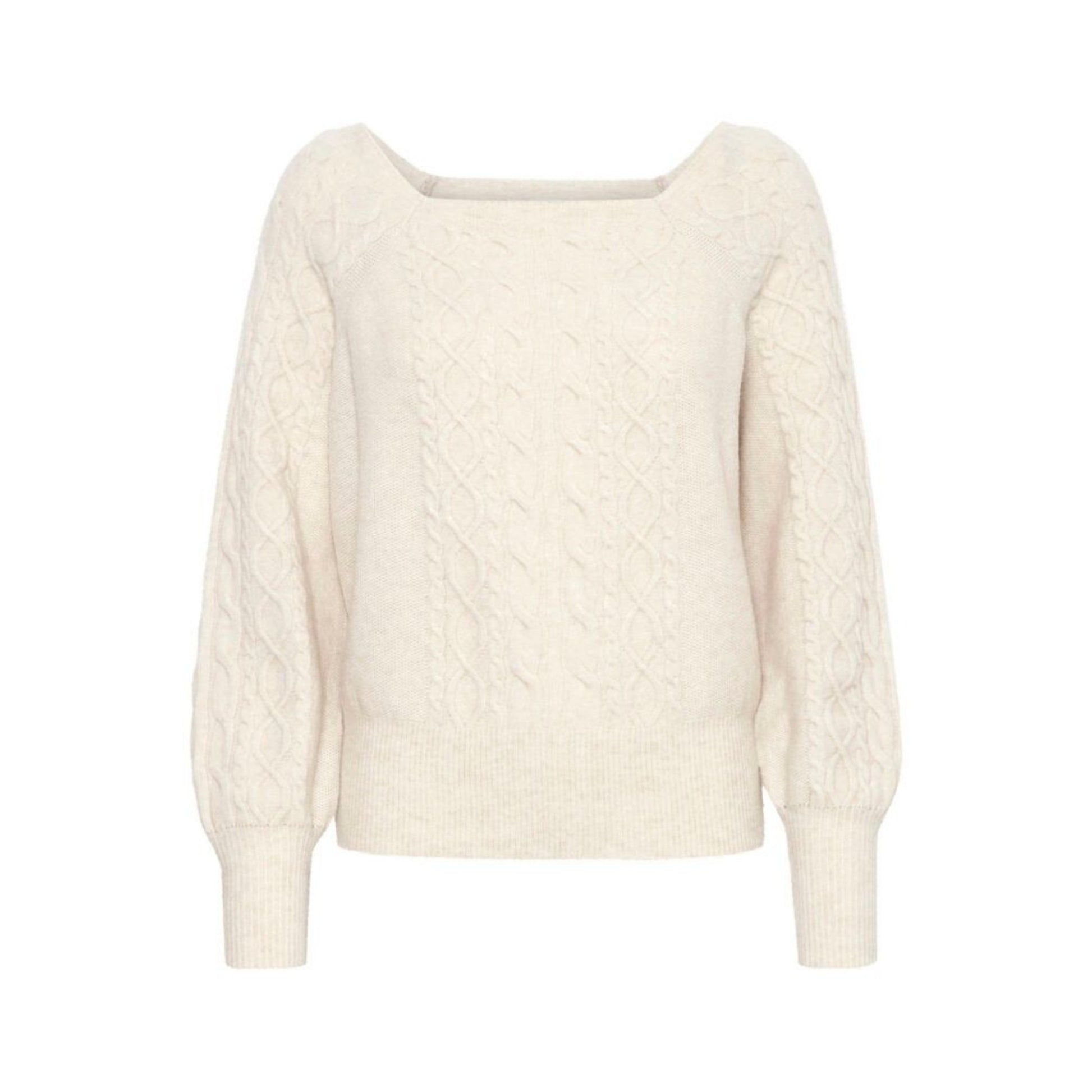 Maglia donna in tessuto soft touch mano lana. Scollo quadrato, maniche lunghe con polsini elasticizzati e fondo a palloncino. Motivo a trecce di diverse forme e dimensioni. Vestibilità comoda. Composizione tessuto 37% nylon, 30% poliestere, 27% acrilico, 6% elastane.