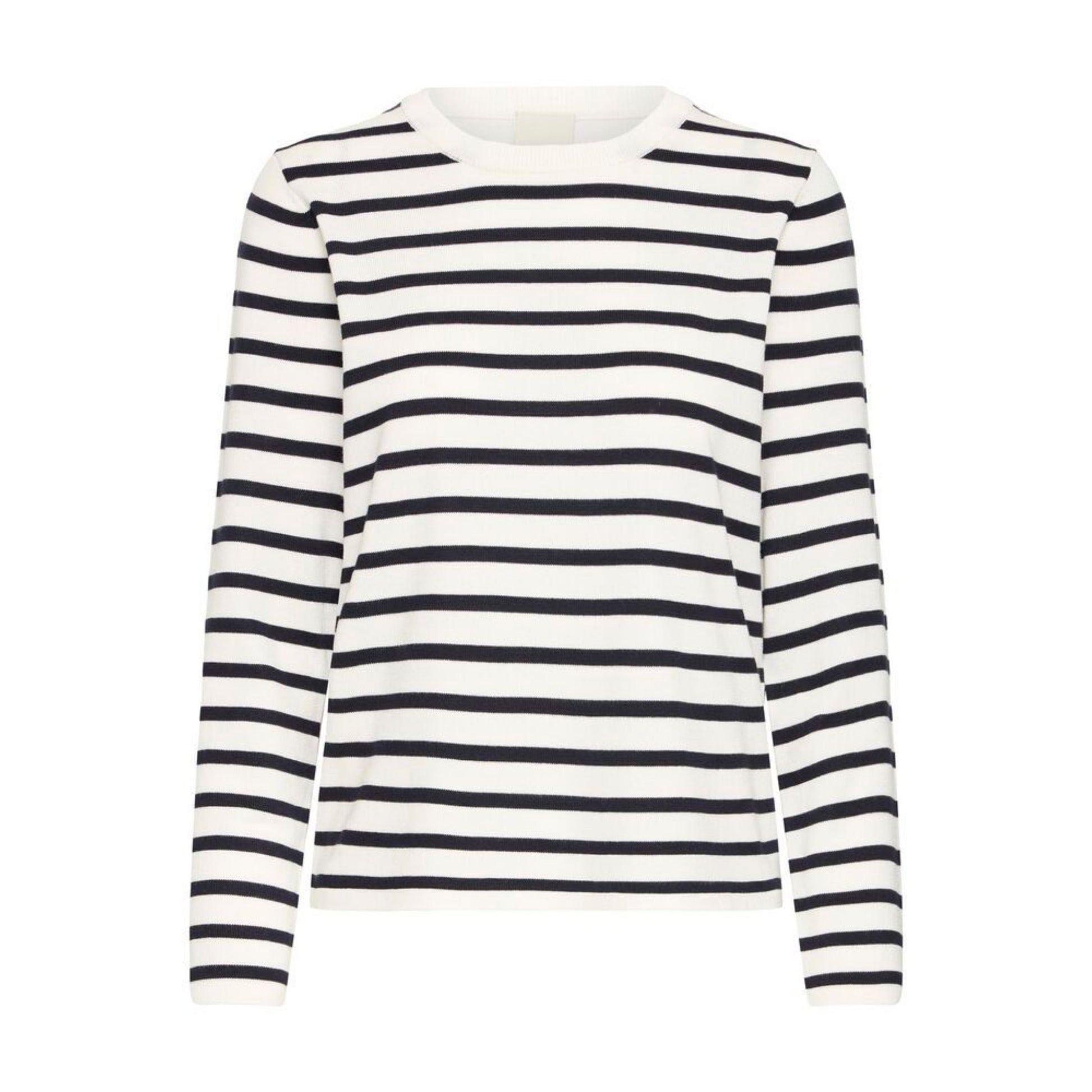 Maglia donna basic in tessuto misto viscosa primo peso. Girocollo con bordo liscio. Motivo a righe strette. Vestibilità dritta. Taglia in foto S. Composizione tessuto 80% viscosa 20% poliammide.