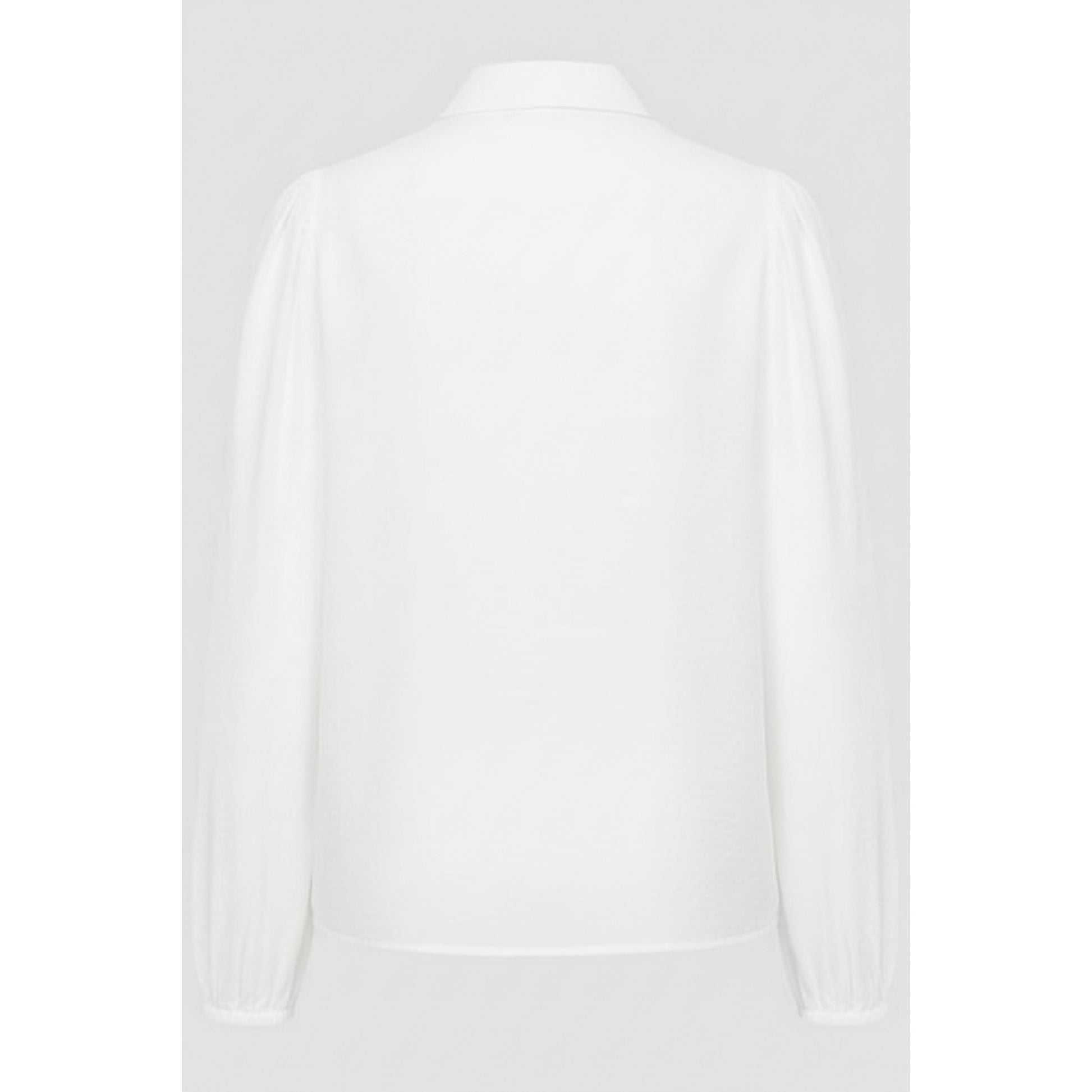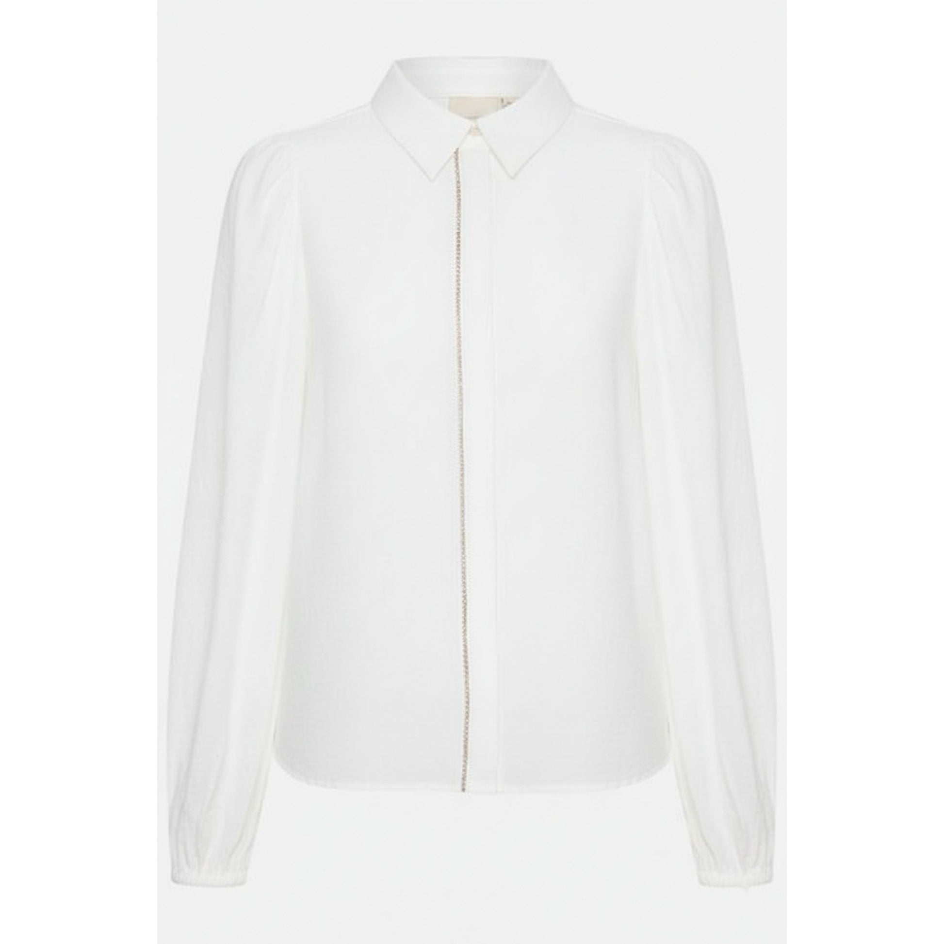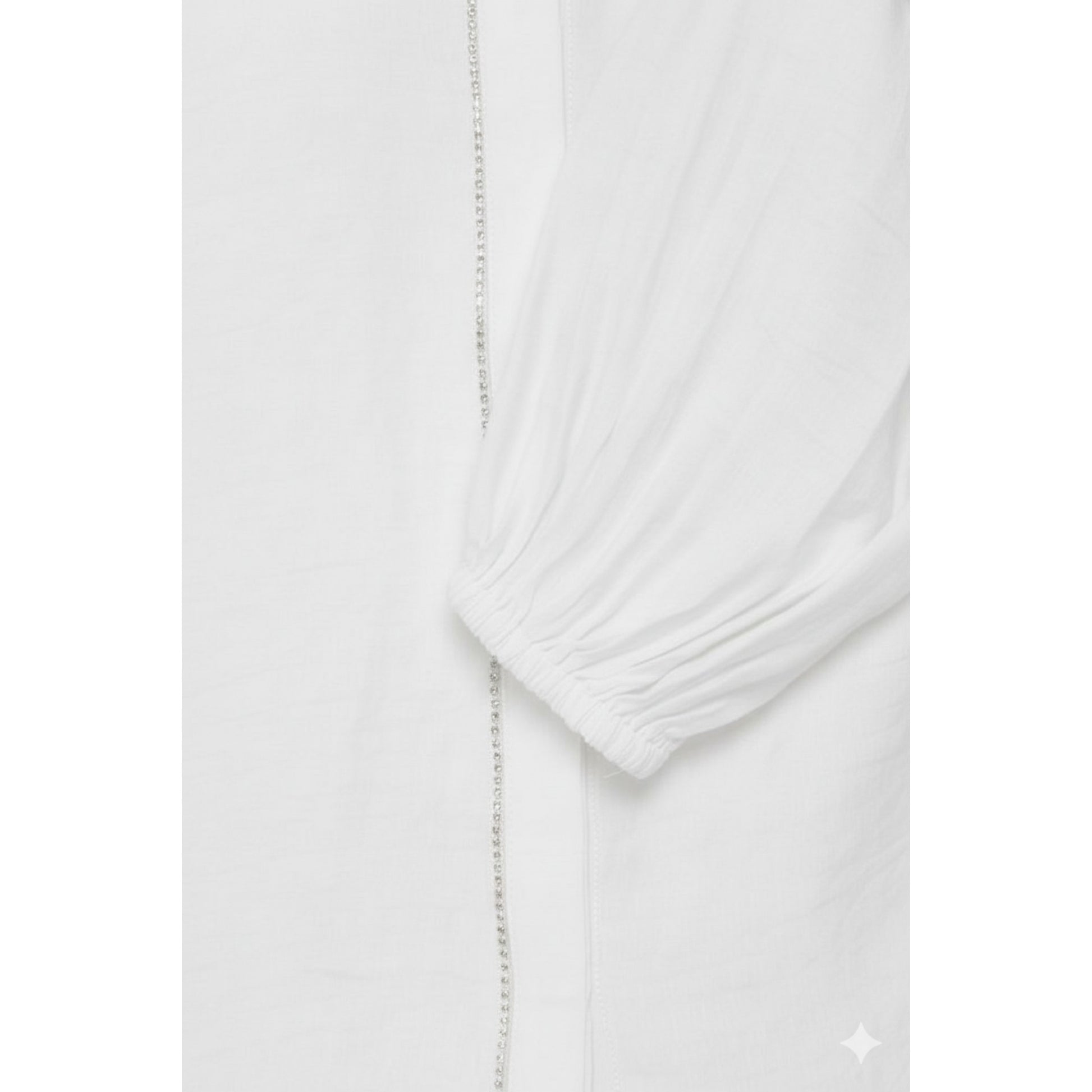 Camicia donna in tessuto goffrato misto viscosa. Colletto piccolo, chiusura centrale con bottoni coperta da pattina con dettaglio di strass lungo tutta la lunghezza. Maniche lunghe con elastico al polso e fondo a sbuffo. Vestibilità dritta. Composizione tessuto 80% viscosa 20% poliammide.