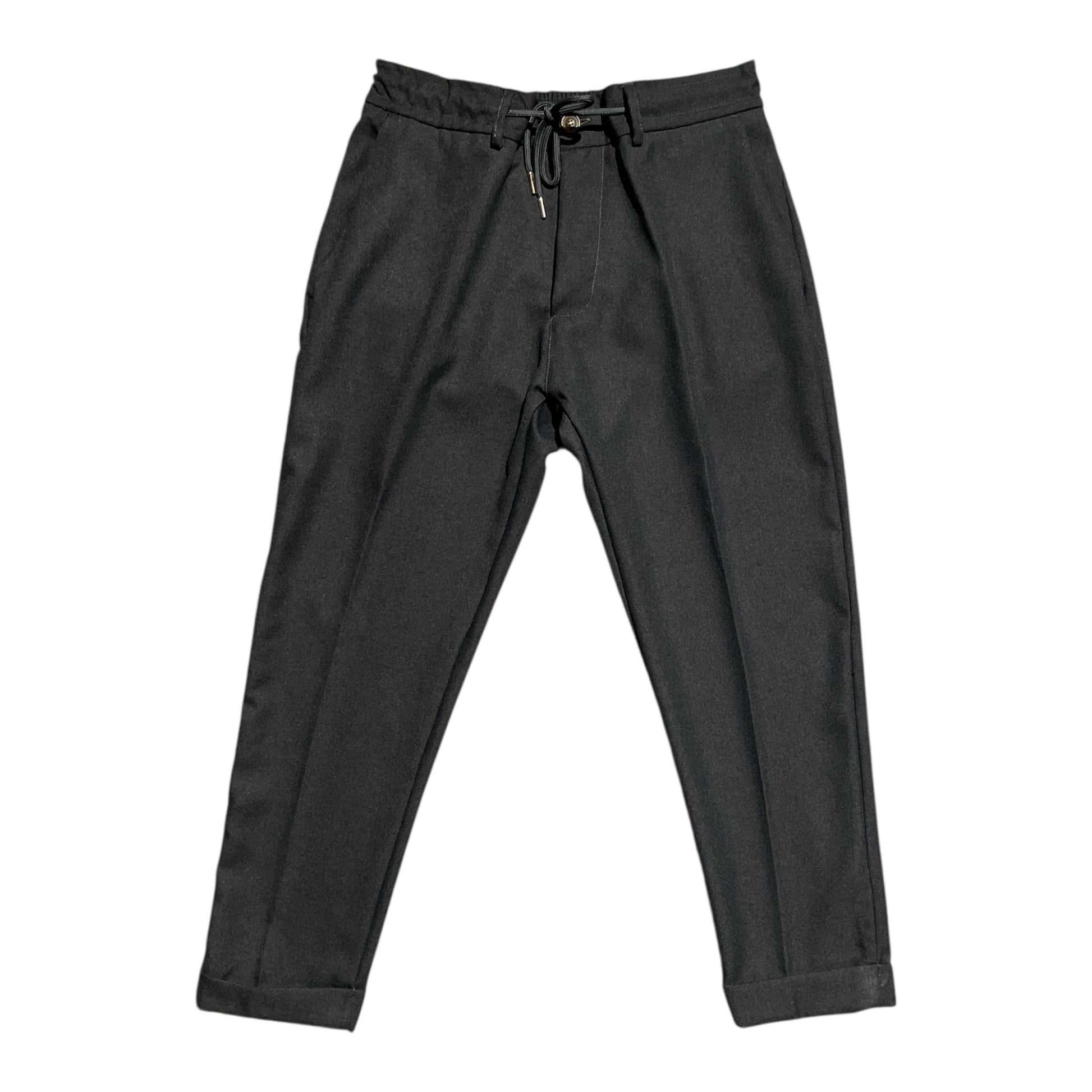 Pantalone modello pantalaccio in tessuto tecnico. Vita regolare con elastico sulla schiena e cinturino fisso sul davanti con coulisse in tessuto e chiusura con zip e bottone. Tasche a filo laterali, tasche a filetto posteriori. Gamba con piega stirata, vestibilità slim e fondo con piega con risvolto. Lunghezza capri. Composizione tessuto 63% poliestere, 24% viscosa, 13% lana.