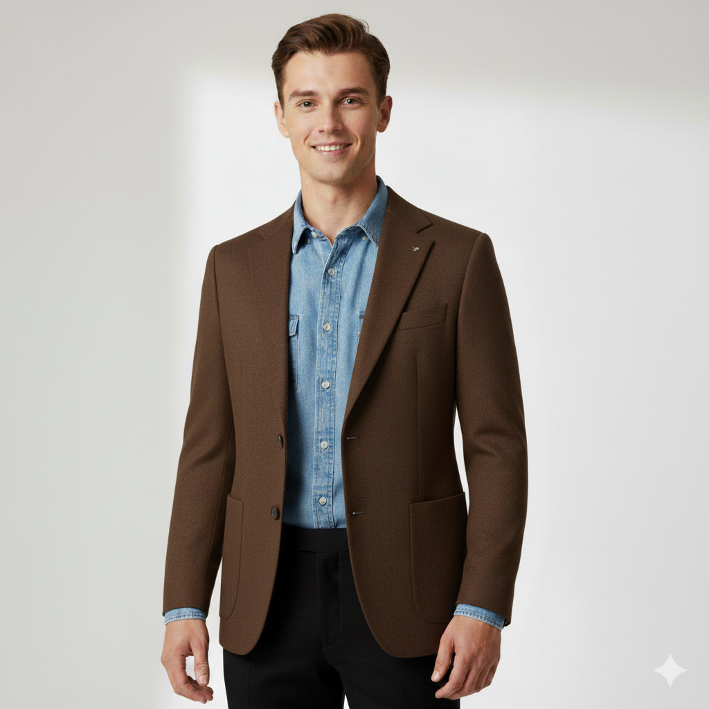 Giacca uomo sfoderata in tessuto operato. Revers regolari, chiusura con bottoni in colore a contrasto. Tasche quadrate applicare, taschino sul petto. Dettagli interni in tessuto rasato colorato. Vestibilità regolare.