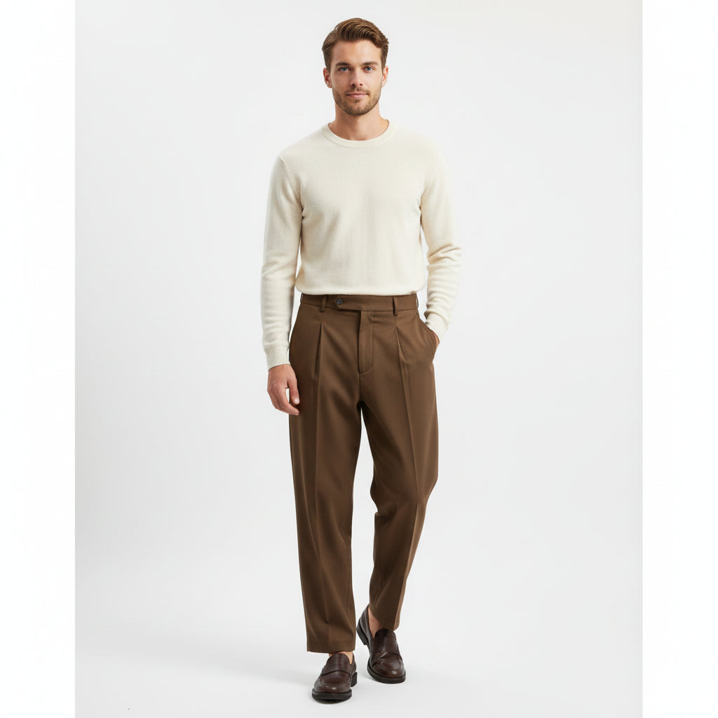 Pantalone uomo comfort fit in tessuto tecnico misto viscosa. Vita alta con pences, chiusura con zip e pattina lunga chiusa con bottone. Tasche laterali. Gamba larga e fondo ampio, vestibilità loose. Composizione tessuto 66% poliestere 31% viscosa 03% elastan.