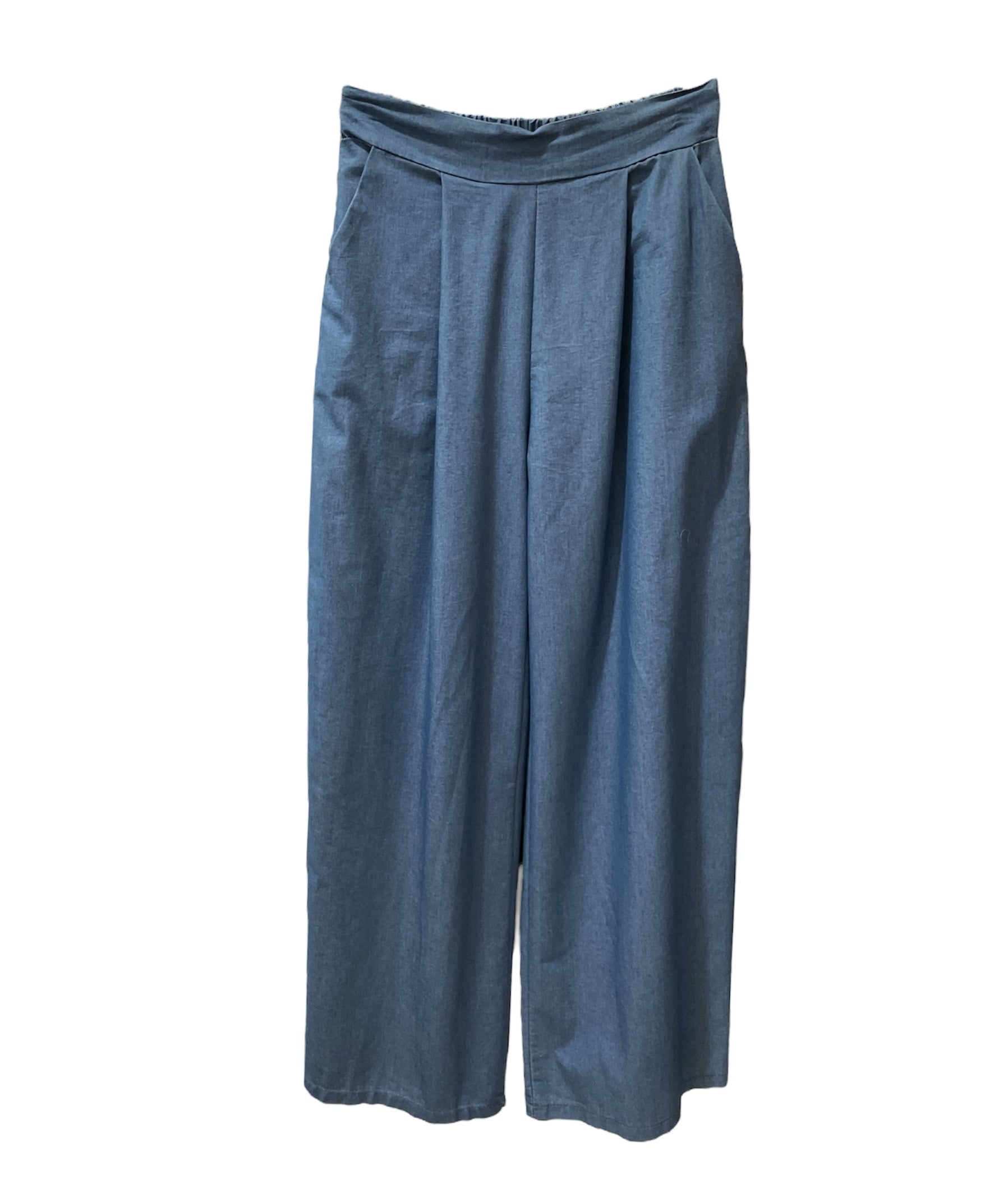 Pantalone in tessuto denim di cotone elasticizzato. Vita alta con fascia fissa sul davanti ed elastico sulla schiena. Pences in vita. Gamba e fondo palazzo. Vestibilità regolare. Veste dalla 40 alla 46. Composizione tessuto 65% cotone 32% poliestere 3% spandex.