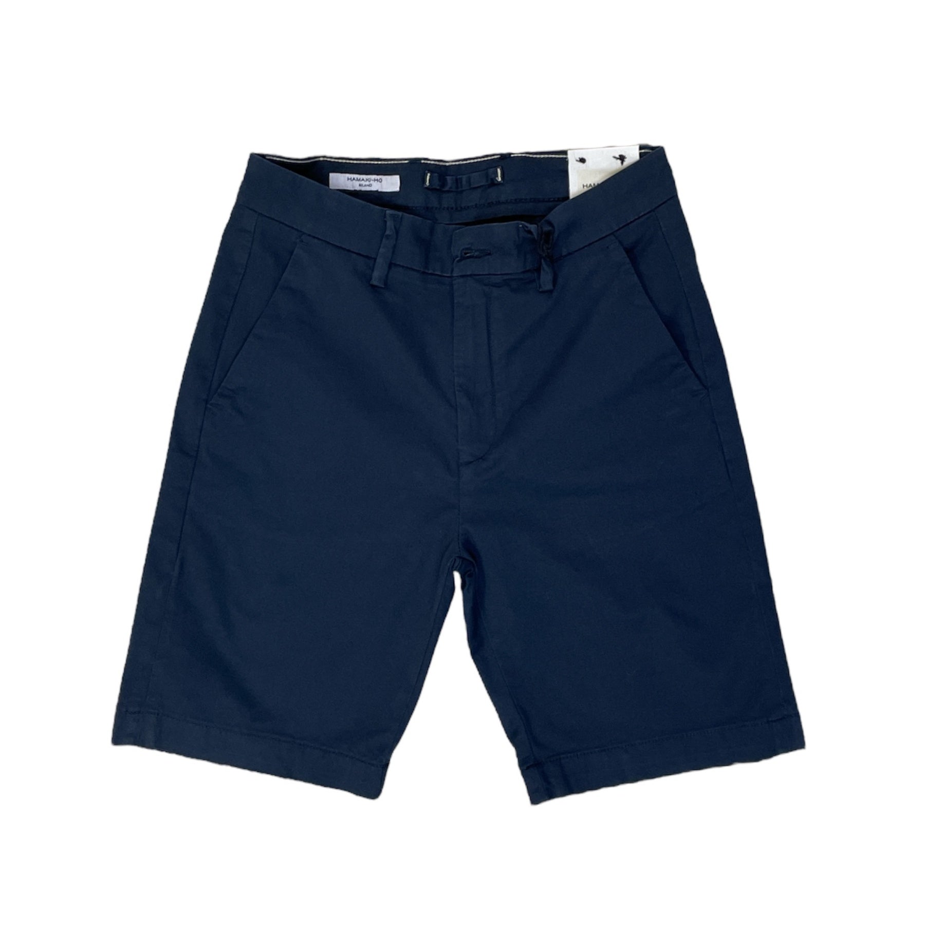 Bermuda basico in tessuto cotone elasticizzato. Vita regolare, chiusura con zip e bottone, tasche a filo laterali. Gamba slim. Vestibilità regolare. Composizione tessuto 98% cotone 2% elastan.