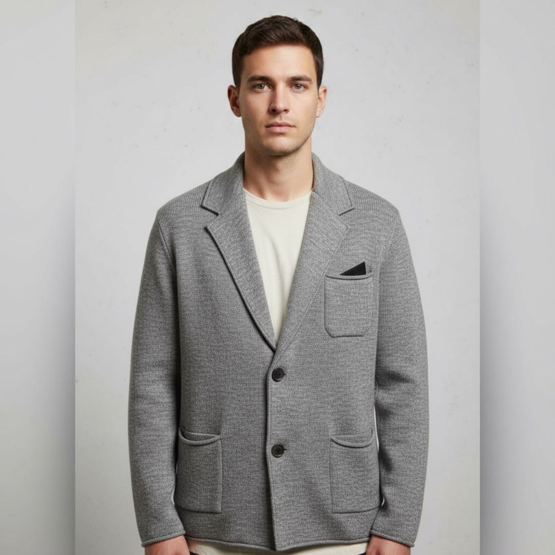 Cardigan uomo modello giacca in tessuto lavorato a maglia grossa misto lana. Collo modello giacca, chiusura con bottoni centrali in tinta. Taschino sul petto con fazzoletto abbinato, taschine sul davanti. Vestibilità regolare. Composizione tessuto 70% acrilico 30% lana.