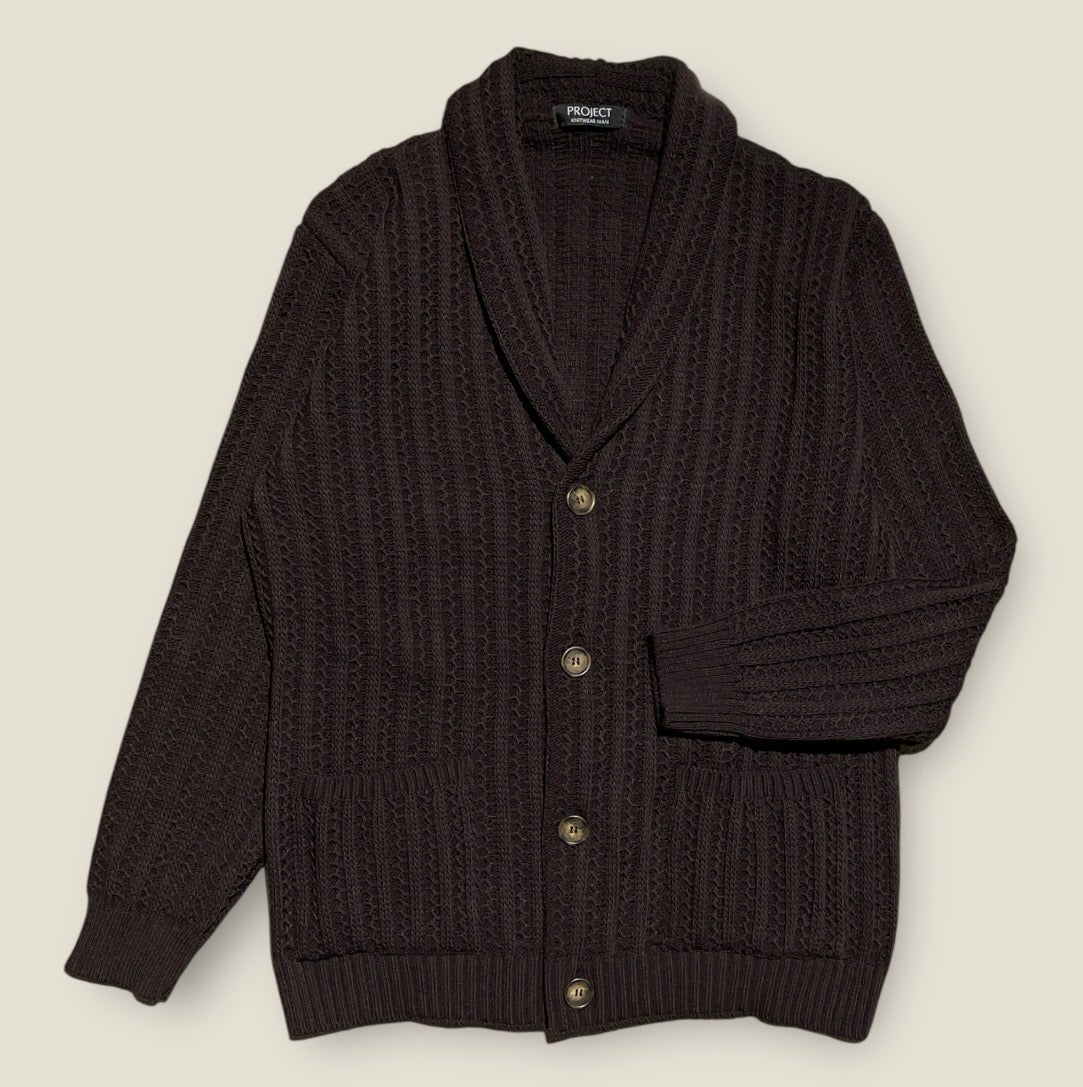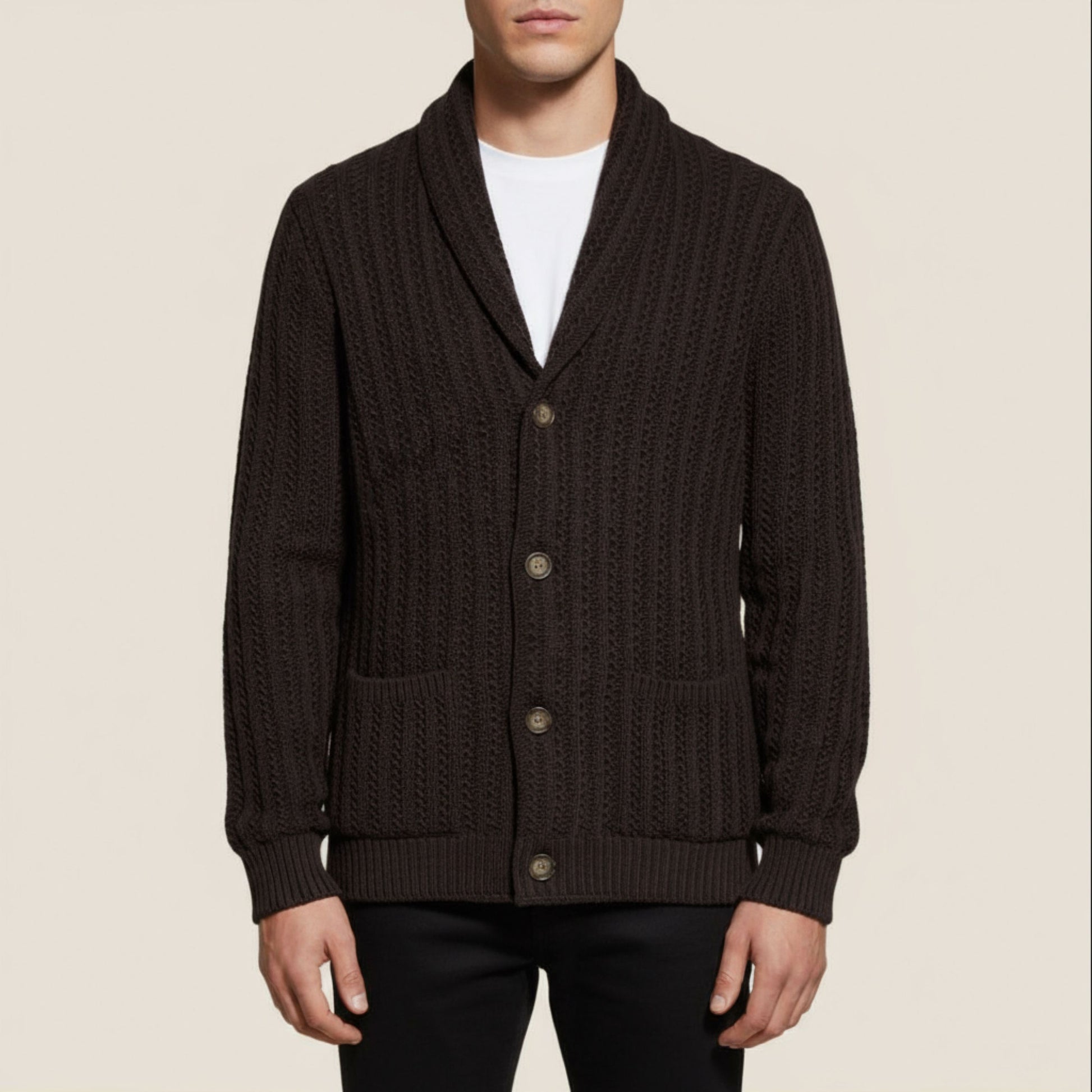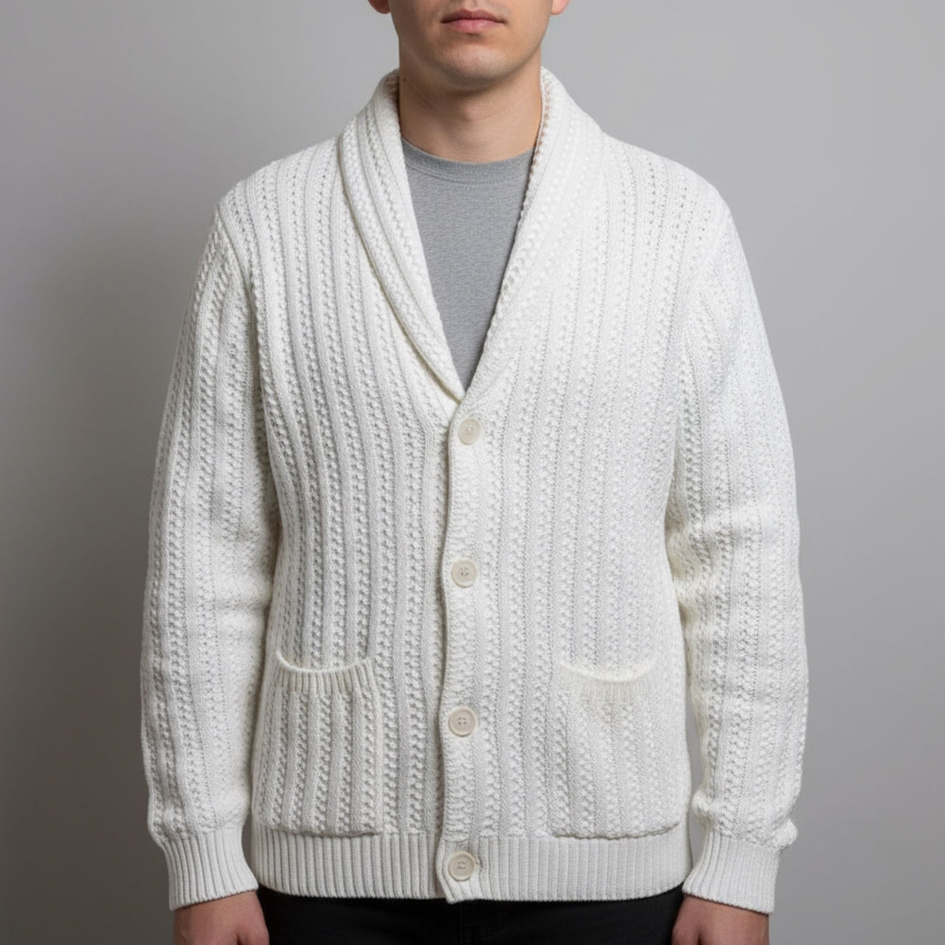 Cardigan uomo modello giacca in tessuto lavorato a maglia grossa misto lana. Collo sciallato, chiusura con bottoni centrali in tinta. Tasche quadrate applicate. Tessuto lavorato con intrecci. Vestibilità regolare. Composizione tessuto 70% acrilico 30% lana.