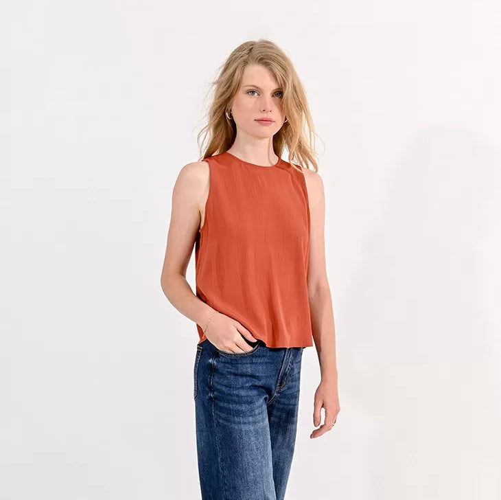 Canotta in tessuto fluido misto viscosa. Girocollo regolare, chiusura con bottone sul collo e goccia sulla schiena. Tessuto lavorato effetto stropicciato. Vestibilità dritta. Taglia in foto S. Composizione tessuto 51% viscosa 49% poliestere. Crea il completo con il pantalone abbinato .