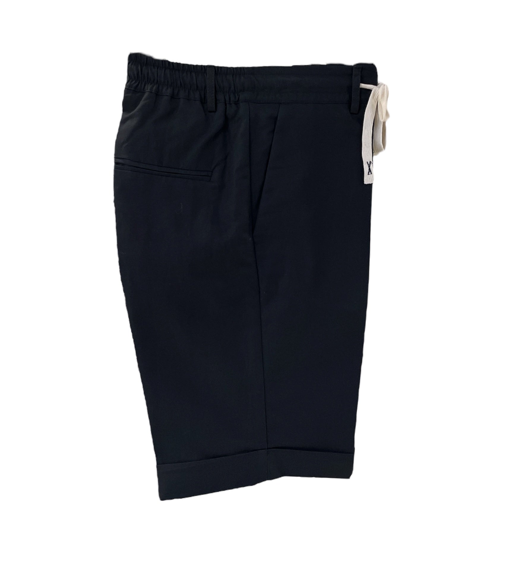 Bermuda basico in tessuto leggero 100% lino lavorazione mélange. Vita regolare con elastico, coulisse sul davanti per modulare la vestibilità. Chiusura con zip e bottone, tasche a filo laterali e taschino posteriore. Gamba slim e fondo con piega con risvolto.