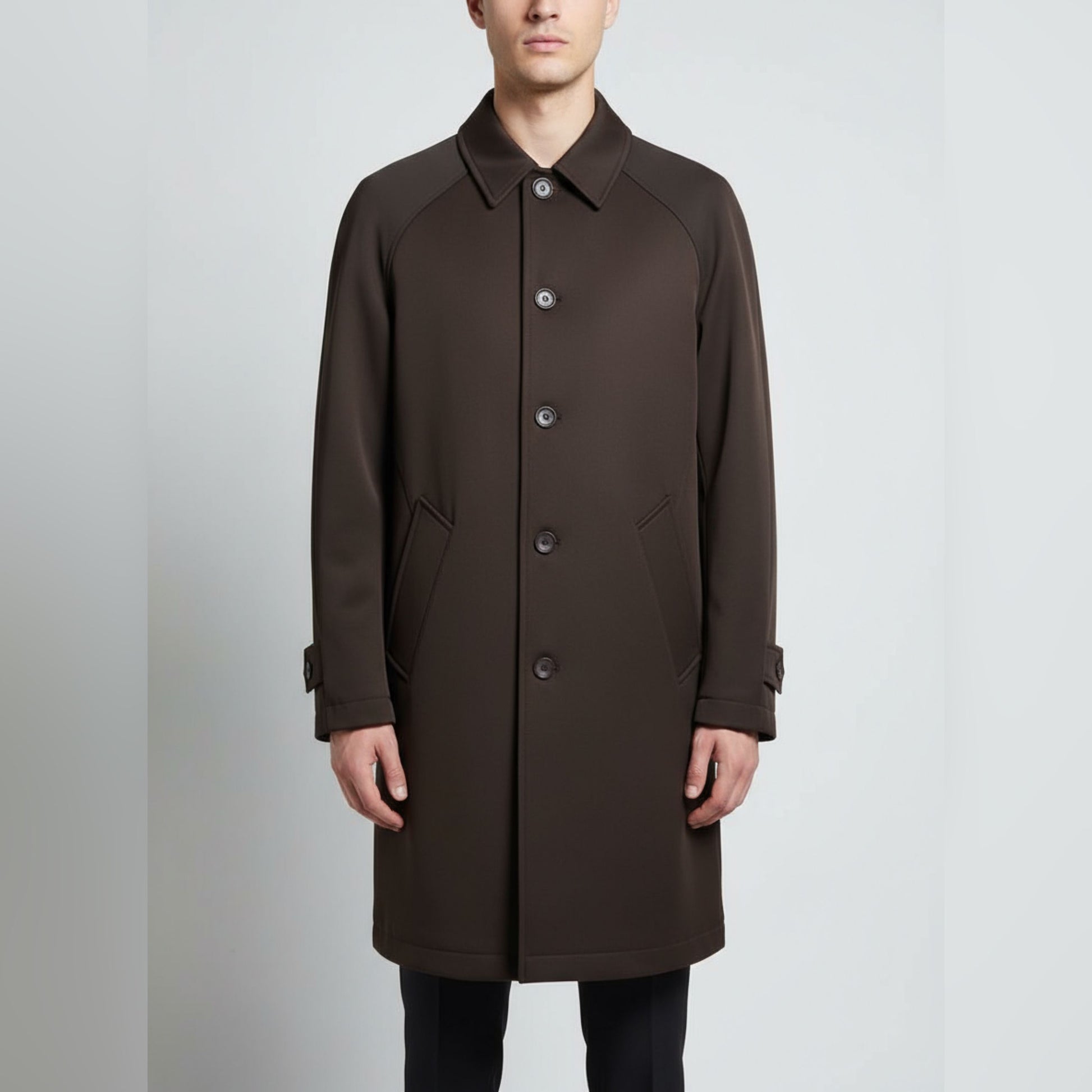 Trench uomo in tessuto tecnico. Particolare spalla raglan, colletto classico. Chiusura con bottoni in tinta, dettaglio impunture su tutta la lunghezza. Maniche lunghe con dettaglio mostrina sui polsi. Interno foderato matelassé. Vestibilità regolare. Composizione tessuto 96% poliestere 4% elastan.