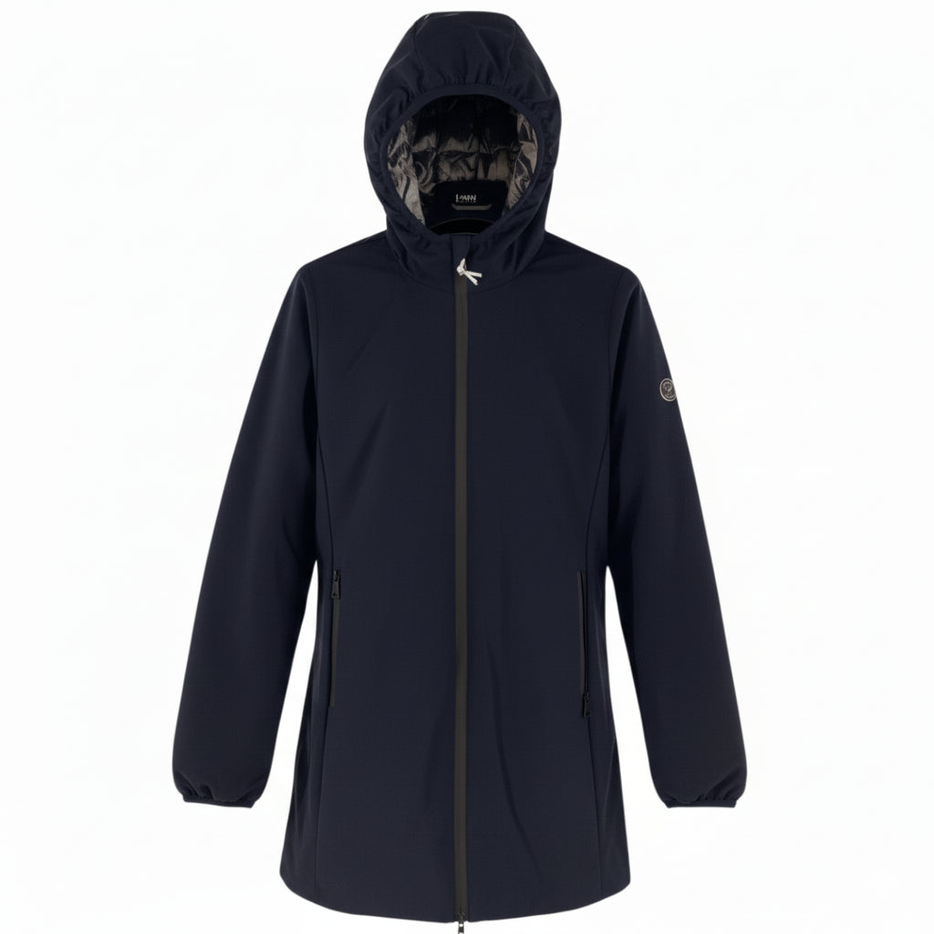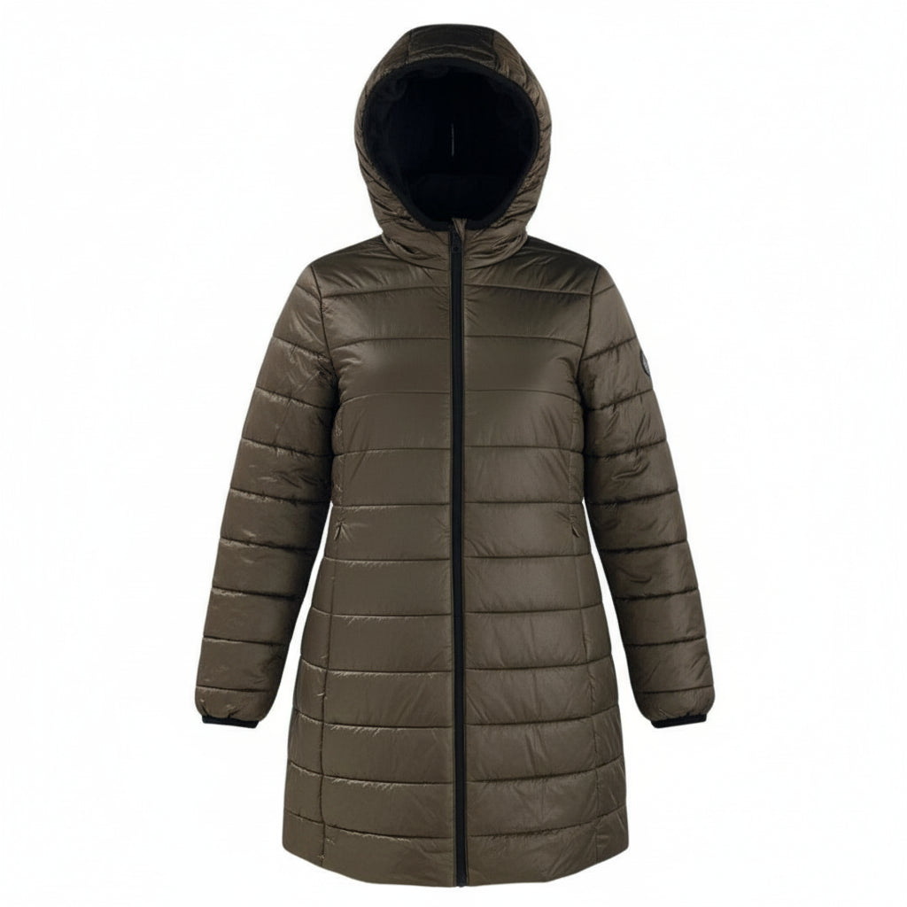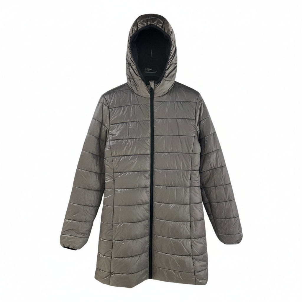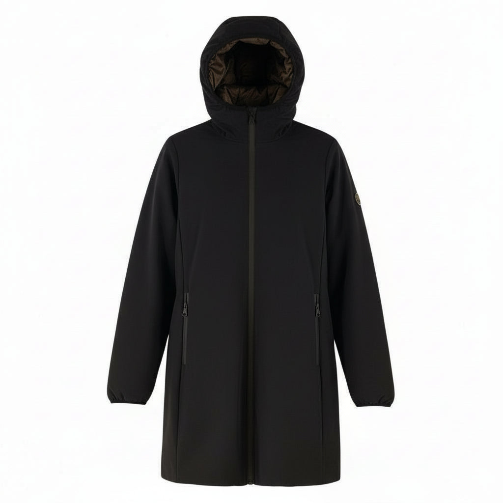 Giubbino donna lungo reversibile, modello parka in tessuto tecnico. Ampio cappuccio, chiusura con zip gommata, tasche laterali chiuse da zip. Tessuto esterno tecnico liscio, tessuto interno matelassé lucido, tasche chiuse da zip invisibile. Vestibilità regolare.
