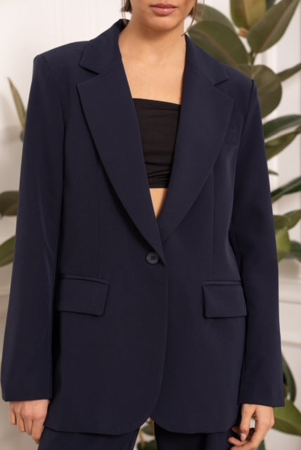 Giacca in tessuto tecnico. Collo con tevers a lancia, chiusura centrale ad un bottone, tasche laterali con pattina. Fodera in tinta. Vestibilità oversize molto ampia. Consigliamo l'acquisto della taglia che vesti di solito, tenendo conto che questa giacca deve vestire larga. Taglia in foto S/M. Composizione tessuto 96% poliestere 4% elastan. Crea il tailleur con il gilet ed il pantalone palazzo abbinati.