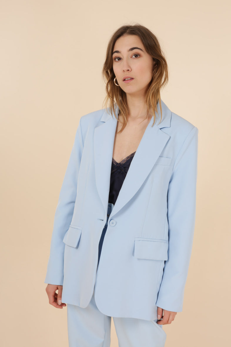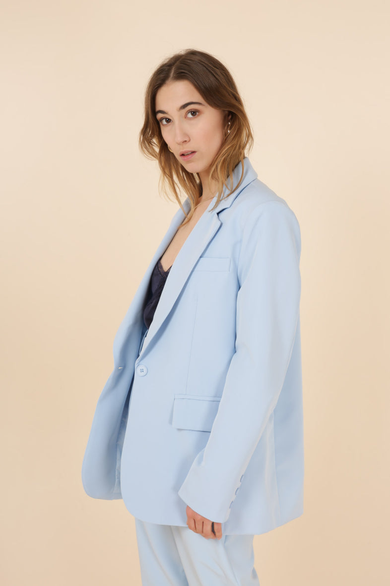 Giacca in tessuto tecnico. Collo con tevers a lancia, chiusura centrale ad un bottone, tasche laterali con pattina. Fodera in tinta. Vestibilità oversize molto ampia. Consigliamo l'acquisto della taglia che vesti di solito, tenendo conto che questa giacca deve vestire larga. Taglia in foto S/M. Composizione tessuto 96% poliestere 4% elastan. Crea il tailleur con il pantalone abbinato.